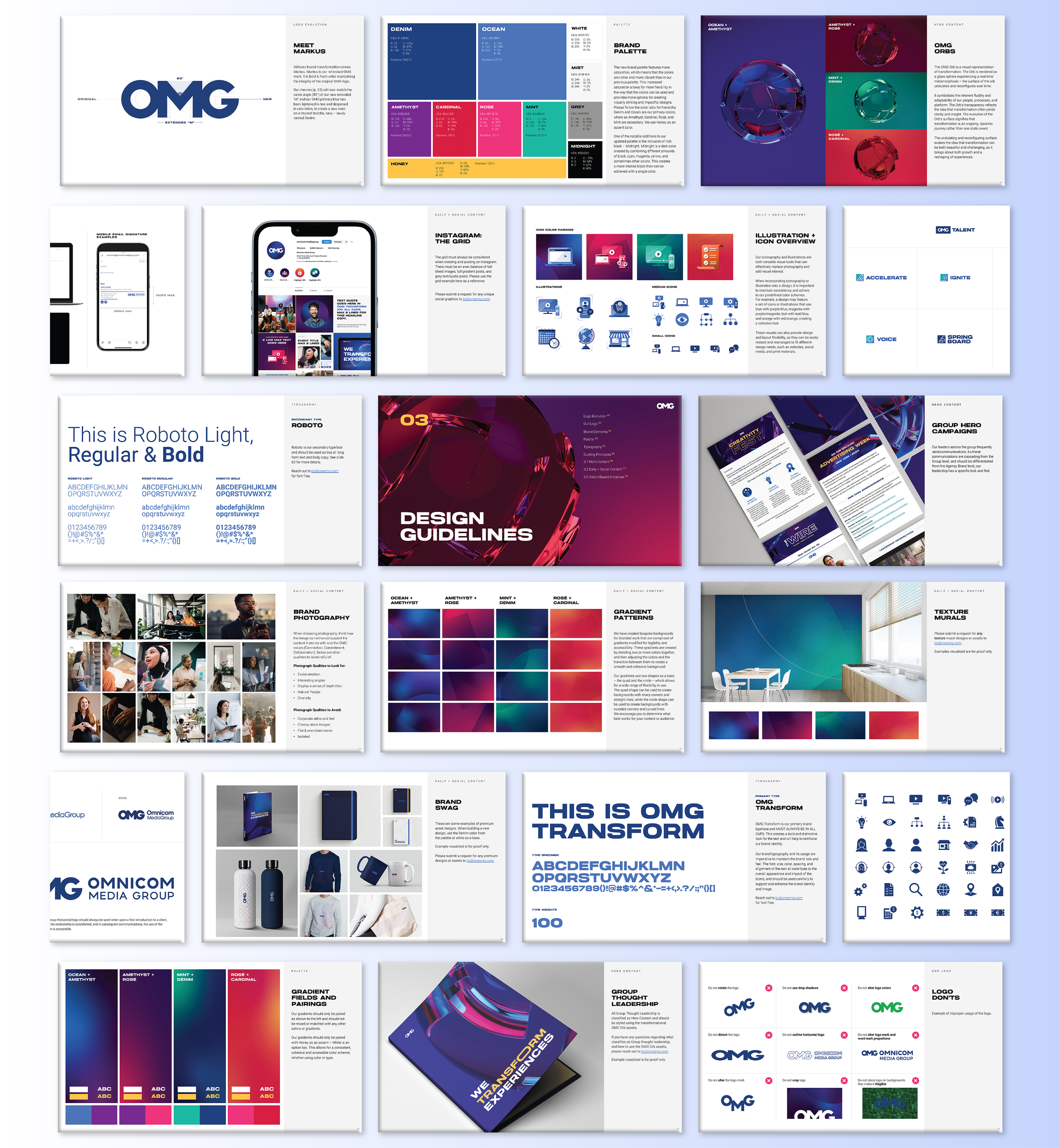 Our goal was to introduce a more expressive system, one that used color, imagery, and motion to create visibility and personality, while still honoring the brand’s equity. We made only subtle refinements to the logo to preserve recognition, but fully rebuilt the surrounding ecosystem. This included partnering with a type designer to develop a custom OMG typeface, establishing a bright, confident color palette inspired by OMG’s individual agencies, illustrating a full library of customized icons and visuals, and designing gradients and modular shapes to create a dynamic visual language.