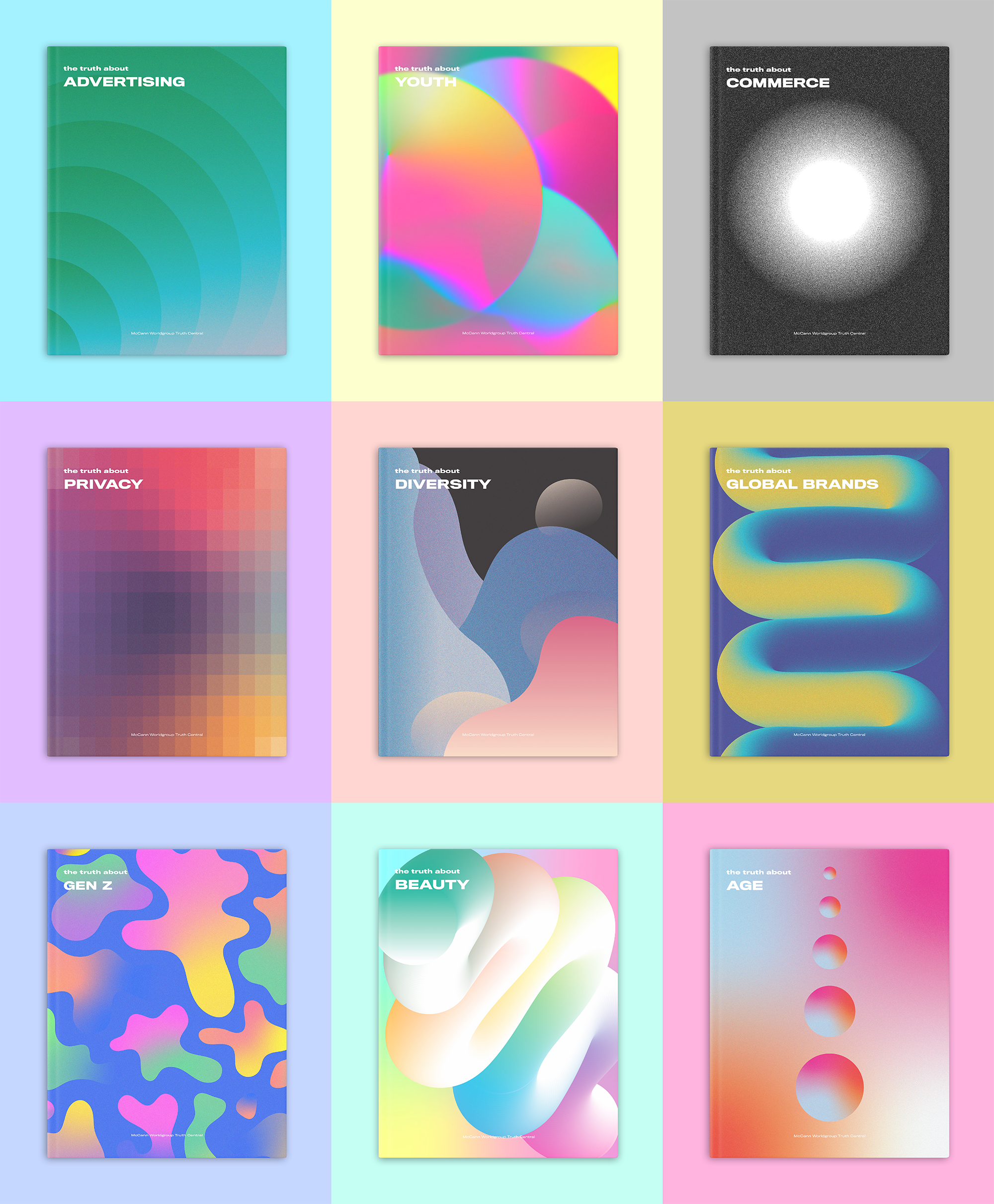 STUDIESTruth Studies is the global research platform produced by McCann Truth Central, the agency’s intelligence unit focused on uncovering deep, enduring human truths. I led the first major rebrand of the program, unifying previously standalone studies into a cohesive, modern visual system. The new identity leaned into bold color, dynamic typography, and abstract shapes – each study receiving its own tailored palette and motif based on its theme while still fitting within one connected visual language. The system became the foundation for all quarterly reports and new studies moving forward.